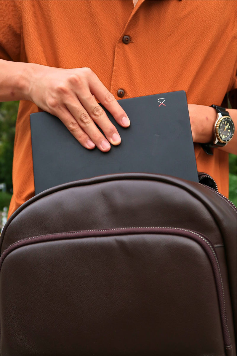 Unisex cowhide leather Multi zip V3 design backpack with luggage/trolley sleeve