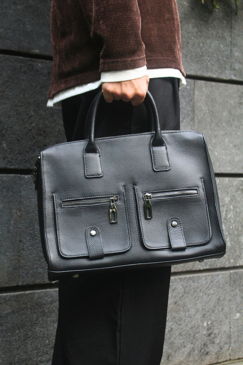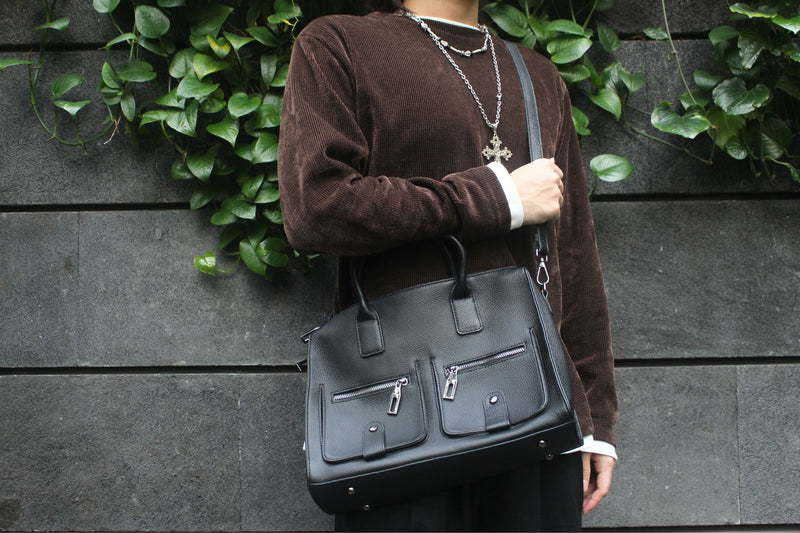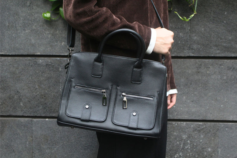 Unisex genuine cowhide leather top handle briefcase laptop bag poches design