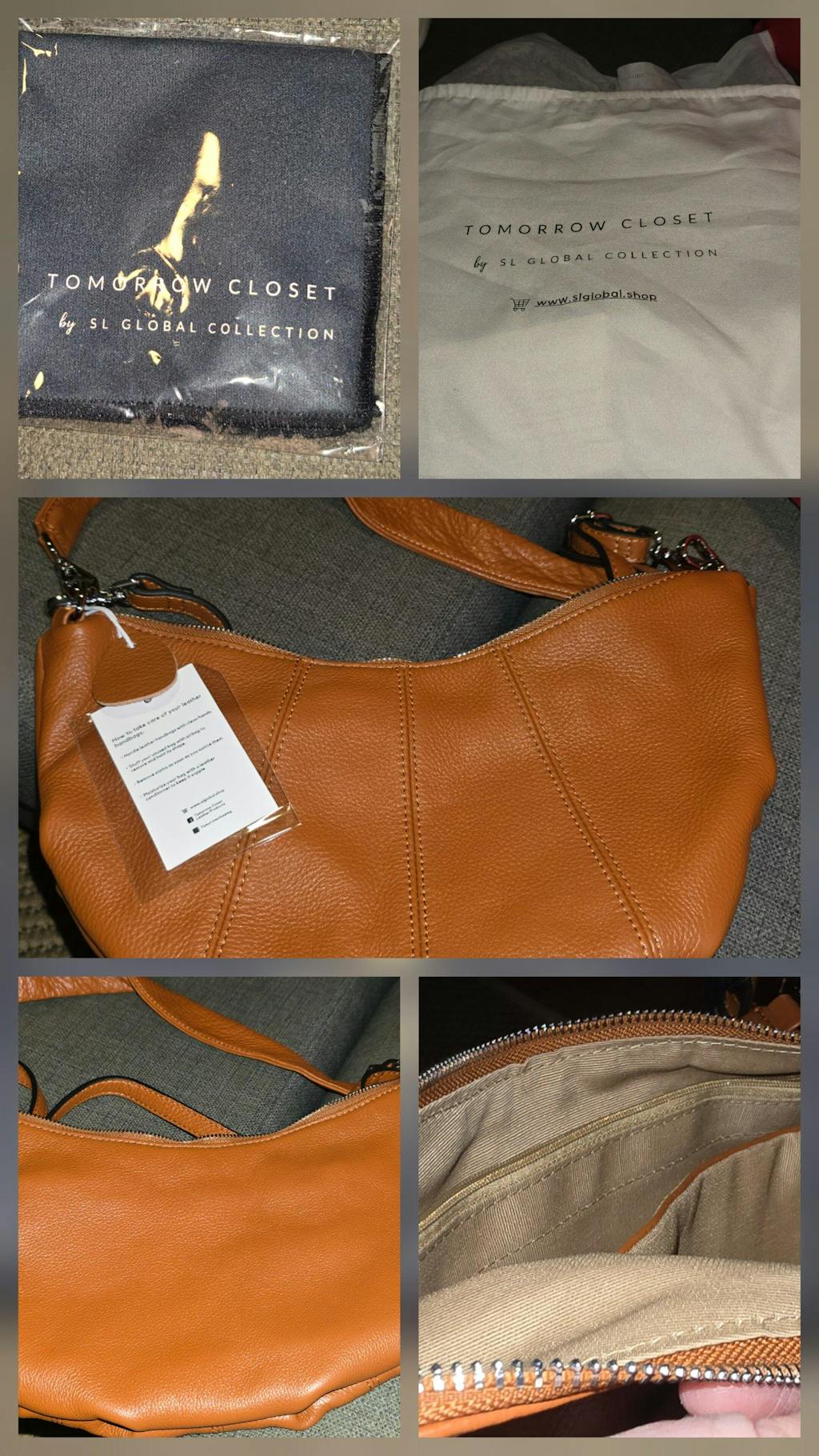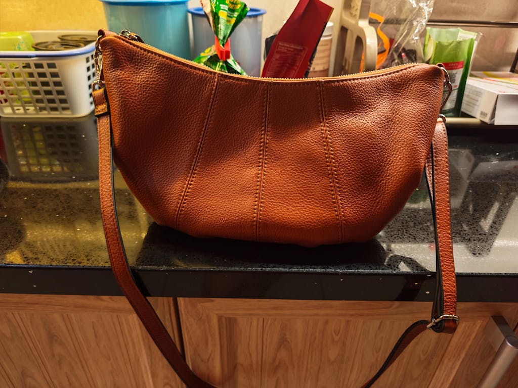 Love the leather,color of this crossiant shaped bag. It also can be a cross body & shoulder bag. Spacious storage.